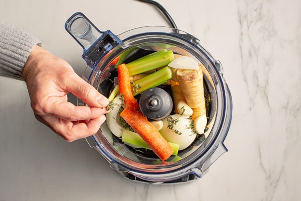 Step 2: Place the onion, celery, carrot, parsnip, garlic and thyme into the Vitamix container in the order listed and secure the lid. Pulse the mixture 5 – 6 times until evenly chopped.