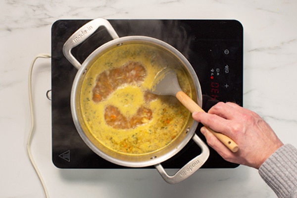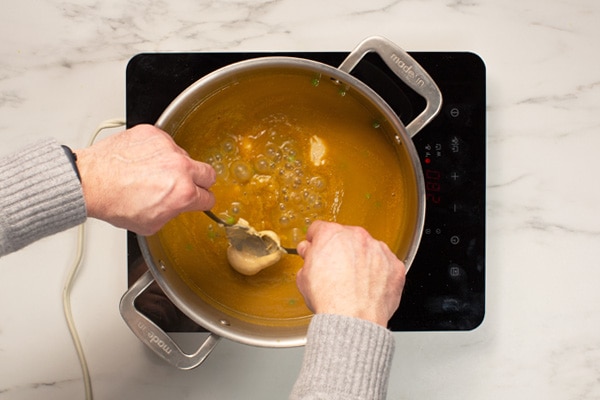 Step 3: Heat a large soup pot to medium high heat. Add the oil then add the vegetable mixture and salt. Sauté for 5 – 7 minutes. Add stock and bring to a boil. Reduce the heat and simmer for 10 minutes.