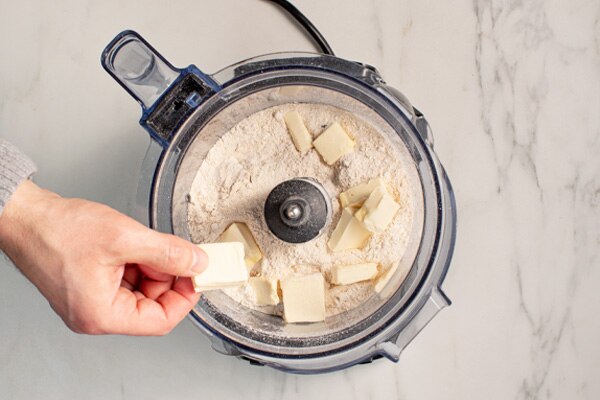 Step 1: Fit the Food Processor Attachment with the Multi-Use Blade. Place the flour and salt into the Vitamix container, secure the lid and pulse twice. Add the butter pats and pulse 5–6 times until mealy. Add water 1 Tablespoon at a time while pulsing until the dough comes together into a ball.