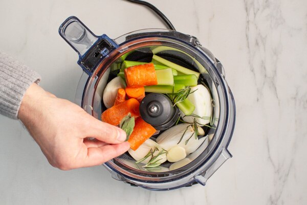 Step 3: Place the onion celery, garlic, sage and rosemary into the Vitamix container and secure the lid. Pulse the mixture 5–6 times to chop. Remove to a separate bowl. Place the fennel and potatoes into the Vitamix container and secure the lid. Pulse the mixture 4–5 times to chop.
