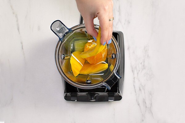 Place coconut water, orange, lime, honey, and mango into the Vitamix container in the order listed and secure the lid.