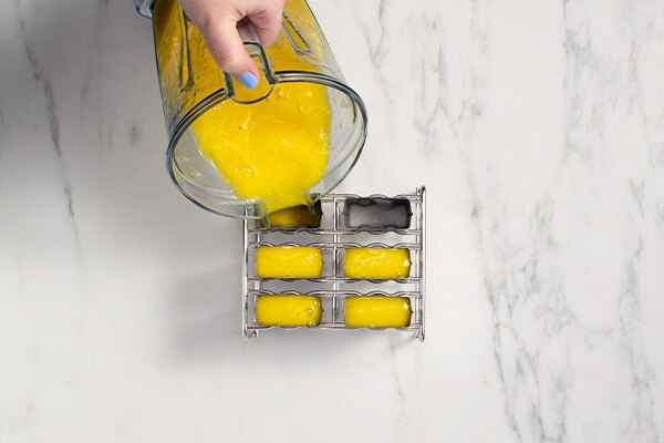 Pour the coconut milk evenly into the ice-pop molds until they’re 1/4 to 1/3 full. Pour the blended mixture on top of the coconut milk.