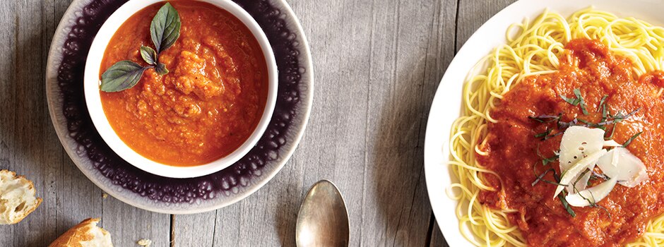 Marinara works just as well with spaghetti squash as it does with pasta. Blend tomatoes, garlic, onions, carrots, olive oil, herbs and spices in your Vitamix machine. Cook the sauce with a bay leaf for 15 minutes and season it to taste. Toss the pasta with the sauce just before serving.